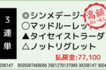 1着:◎スターペスショウマ(1人気) 2着:▲ジョイスマイリー(2人気) 3着:注サシバ(9人気) 3連単:11-8-10:500円x25.6倍=12,800円 [hit_race:https://yoso.sp.net...