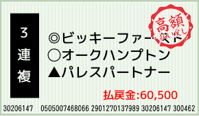 1着:◎ビッキーファースト(1人気) 2着:○オークハンプトン(2人気) 3着:▲パレスパートナー(4人気) 3連複:8-9-10:5,000円x5.1倍=25,500円 3連単:9-8-10:2,500円x14.0倍=...