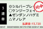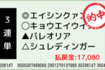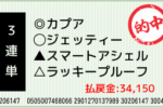 1着:◎フィエレッツァ(1人気) 2着:▲アレスエルピーダ(2人気) 3着:注アベニンスマイル(5人気) 3連複:7-10-11:400円x10.8倍=4,320円 3連単:11-10-7:300円x42.6倍=12,7...