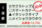 1着:◎ノーザトゥルース(1人気) 2着:注エイシンゾディアク(6人気) 3着:○デルマプルシャ(2人気) 3連複:10-11-13:500円x22.5倍=11,250円 3連単:13-11-10:200円x95.7倍=...