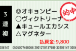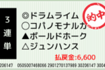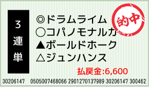 1着:▲ボールドホーク(2人気) 2着:◎ドラムライム(1人気) 3着:○コパノモナルカ(3人気) 3連単:1-7-3:200円x33.0倍=6,600円 [hit_race:https://yoso.sp.netkei...