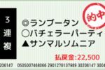 1着:▲サンマルソムニア(1人気) 2着:◎ランブータン(3人気) 3着:○バチェラーパーティ(2人気) 馬連:1-6:2500円x4.3倍=10,750円 3連複:1-6-10:2,500円x4.7倍=11,750円 ...