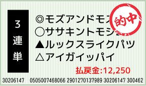 1着:◎モズアンドモズ(1人気) 2着:△アイガイッパイ(3人気) 3着:☆ケイアイワカポノ(2人気) 3連単:10-3-1:500円x24.5倍=12,250円 [hit_race:https://yoso.sp.ne...