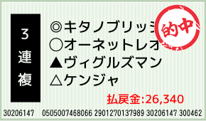 1着:注セイウンアーテル(8人気) 2着:◎キタノブリッジ(1人気) 3着:○オーネットレオ(7人気) 3連複:4-5-10:600円x43.9倍=26,340円 [hit_race:https://yoso.sp.ne...