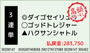 1着:◎ダイゴセイリュウ(2人気) 2着:○ゴッドトレジャー(1人気) 3着:▲ハクサンシャトル(10人気) 3連複:2-5-11:5,000円x25.2倍=126,000円 3連単:2-5-11:2,500円x63.1...