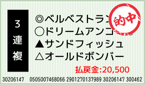 1着:▲サンドフィッシュ(4人気) 2着:◎ベルベストランナー(1人気) 3着:○ドリームアンコール(2人気) 3連複:2-9-10:5,000円x4.1倍=20,500円 [hit_race:https://yoso....