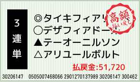 1着:◎タイキフィアリーベ(1人気) 2着:○デザフィアドール(4人気) 3着:☆サンクリュウ(3人気) 3連単:7-10-5:1200円x43.1倍=51,720円 [hit_race:https://yoso.sp....