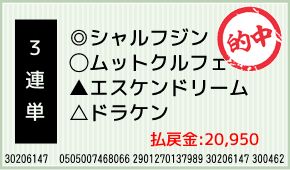 1着:◎シャルフジン(2人気) 2着:○ムットクルフェ(3人気) 3着:▲エスケンドリーム(1人気) 3連複:2-3-4:2,000円x4.6倍=9,200円 3連単:3-2-4:500円x23.5倍=11,750円 [...