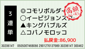 1着:◎コモリボルダー(2人気) 2着:○イービジョンスター(4人気) 3着:▲キングバブルズ(3人気) 3連単:10-12-5:1,000円x86.9倍=86,900円 [hit_race:https://yoso.s...