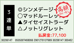 1着:○マッドルーレット(3人気) 2着:◎シンメデージー(1人気) 3着:注ラジカルバローズ(4人気) 3連単:6-8-9:1,000円x77.1倍=77,100円 [hit_race:https://yoso.sp....