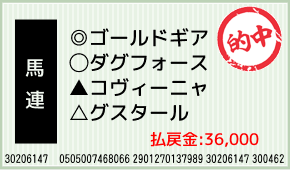 1着:◎ゴールドギア(5人気) 2着:▲コヴィーニャ(3人気) 3着: ヒフミバンダム(4人気) 馬連:4-11:2,000円x18.0倍=36,000円 [hit_race:https://yoso.sp.netkei...