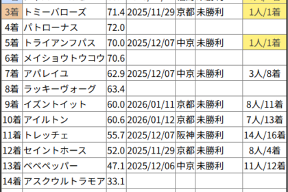 ※見解・買い目はこちらを参照ください。 前走戦った相手が次走好走しているレース出身馬の一覧です。 今回のメンバー相手に通用するかは、スピード指数表と合わせてご覧下さい。 2026/02/13 船橋1R 3歳未出走 未受賞...