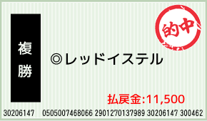 1着: バセリーナ(13人気) 2着: スピンザブラッド(4人気) 3着:◎レッドイステル(3人気) 複勝:8:5,000円x2.3倍=11,500円 [hit_race:https://yoso.sp.netkeiba...
