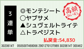 1着:○ヤブサメ(2人気) 2着:◎モンテシート(1人気) 3着:▲シュヴェルトライテ(11人気) 馬連:1-8:1,500円x7.4倍=11,100円 ワイド:1-8:3,300円x3.9倍=12,870円 3連単:1...