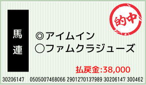 1着:○ファムクラジューズ(4人気) 2着:◎アイムイン(1人気) 3着: タイドグラフ(3人気) 馬連:6-13:5,000円x5.4倍=27,000円 ワイド:6-13:5,000円x2.2倍=11,000円 [hi...