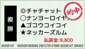1着: ブリガンティン(9人気) 2着:◎チャチャット(5人気) 3着:▲ゴコウコイコイ(3人気) 複勝:3:3,500円x2.8倍=9,800円 [hit_race:https://yoso.sp.netkeiba.c...