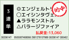 1着:○エイシンタヴェルナ(3人気) 2着:注マリノバレリーナ(2人気) 3着:◎エンジェルトリガー(1人気) 3連単:7-2-3:200円x65.3倍=13,060円 [hit_race:https://yoso.sp...