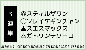 1着:◎スティルザワン(2人気) 2着:○ソレイケギンチャン(1人気) 3着:△ガトリンテソーロ(4人気) 3連単:6-9-4:500円x17.6倍=8,800円 [hit_race:https://yoso.sp.ne...