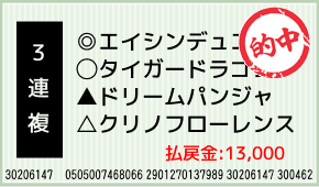 1着:△クリノフローレンス(5人気) 2着:◎エイシンデュエラー(3人気) 3着:○タイガードラゴン(6人気) 3連複:2-4-9:400円x32.5倍=13,000円 [hit_race:https://yoso.sp...