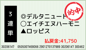 1着:○エイチエヌハーモニ(2人気) 2着:◎デルタニュートラル(1人気) 3着:▲ロッピス(3人気) 3連複:1-4-6:5,000円x1.9倍=9,500円 3連単:2,500円x12.9倍=32,250円 [hit...