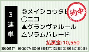 1着:◎メイショウタビズキ(1人気) 2着:○ニコ(3人気) 3着:☆フィエールガール(6人気) 3連単:7-8-1:400円x26.4倍=10,560円 [hit_race:https://yoso.sp.netkei...
