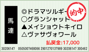 1着:◎ドラマツルギー(3人気) 2着:○グランシャット(1人気) 3着:△ヴァサヴォワール(2人気) 馬連:1-9:5,000円x2.7倍=13,500円 3連複:1-5-9:1,000円x3.5倍=3,500円 [h...