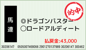 1着:○ロードアルディート(2人気) 2着:◎ドラゴンバスター(1人気) 3着: トーアナカヨシ(7人気) 馬連:2-15:5,000円x5.9倍=29,500円 ワイド:2-15:5,000円x2.7倍=13,500円...