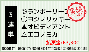 1着:◎ランボーリープ(1人気) 2着:○ヨシノリッキー(2人気) 3着:☆アカノストロング(7人気) 馬連:1-3:5,000円x2.8倍=14,000円 3連単:3-1-6:1,000円x49.3倍=49,300円 ...