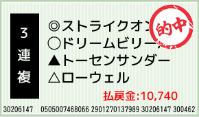 1着:○ドリームビリーバー(7人気) 2着:◎ストライクオン(1人気) 3着:注ルイス(8人気) 3連複:1-4-9:300円x35.8倍=10,740円 [hit_race:https://yoso.sp.netkei...