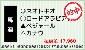 1着:◎ネオトキオ(1人気) 2着:○ロードアラビアン(2人気) 3着:注マザオ(4人気) 馬連:4-9:5,200円x2.5倍=13,000円 3連複:2-4-9:800円x6.2倍=4,960円 [hit_race:...
