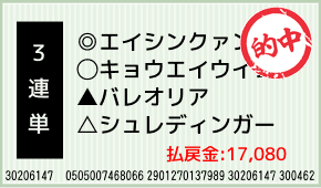 1着:◎エイシンクァンタム(1人気) 2着:△シュレディンガー(6人気) 3着:注シャイニングベル(5人気) 3連単:1-2-7:200円x85.4倍=17,080円 [hit_race:https://yoso.sp....