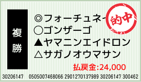 1着: リアルモハメド(7人気) 2着:◎フォーチュネイト(6人気) 3着:注ピンナダ(3人気) 複勝:5:5,000円x4.8倍=24,000円 [hit_race:https://yoso.sp.netkeiba.c...