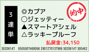 1着:◎カプア(1人気) 2着:○ジェッティー(6人気) 3着:注サクラトップスター(5人気) 3連単:10-9-6:500円x68.3倍=34,150円 [hit_race:https://yoso.sp.netkei...