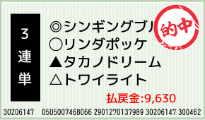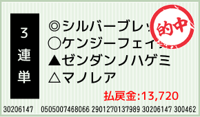 1着:◎シンギングブルース(1人気) 2着:○リンダポッケ(2人気) 3着:△トワイライト(6人気) 3連複:3-7-14:300円x13.5倍=4,050円 3連単:7-14-3:200円x27.9倍=5,580円 [...