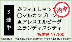 1着:◎フィエレッツァ(1人気) 2着:▲アレスエルピーダ(2人気) 3着:注アベニンスマイル(5人気) 3連複:7-10-11:400円x10.8倍=4,320円 3連単:11-10-7:300円x42.6倍=12,7...