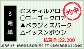 1着:◎スティルアローン(2人気) 2着:○ゴーゴークロア(3人気) 3着:▲ベラジオスパーク(1人気) 3連単:1-7-3:2,000円x11.1倍=22,200円 [hit_race:https://yoso.sp....