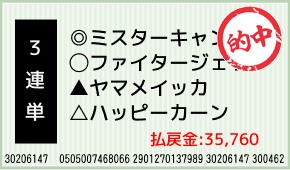 1着:○ファイタージェット(2人気) 2着:◎ミスターキャンベラ(1人気) 3着:注ゴットタレント(6人気) 3連単:16-7-2:800円x44.7倍=35,760円 [hit_race:https://yoso.sp...