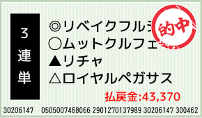 1着:◎アースライザー(1人気) 2着:○コロンバージュ(3人気) 3着:▲レグナム(2人気) 3連複:1-2-8:10,000円x2.7倍=27,000円 [hit_race:https://yoso.sp.netke...