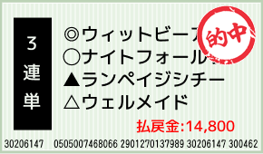 1着:◎ウィットビーアビー(1人気) 2着:○ナイトフォールサン(3人気) 3着:△ウェルメイド(5人気) 3連単:2-3-4:2,000円x7.4倍=14,800円 [hit_race:https://yoso.sp....