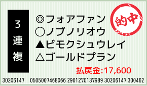 1着:○ノブノリオウ(2人気) 2着:◎フォアファン(1人気) 3着:▲ビモクシュウレイ(3人気) 3連複:3-5-10:4,000円x4.4倍=17,600円 [hit_race:https://yoso.sp.net...
