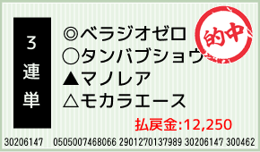 1着:◎ベラジオゼロ(1人気) 2着:△モカラエース(7人気) 3着:○タンバブショウ(2人気) 3連複:1-4-8:500円x9.9倍=4,950円 3連単:4-8-1:200円x36.5倍=7,300円 [hit_r...