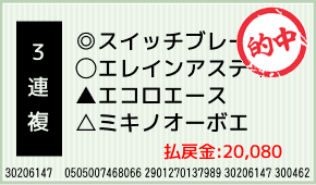 1着:○エレインアスティ(1人気) 2着:◎スイッチブレード(2人気) 3着:注メイショウサキガケ(6人気) 3連複:1-5-7:800円x25.1倍=20,080円 [hit_race:https://yoso.sp....