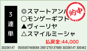 1着:◎スマートアンバー(1人気) 2着:注ラヴィアン(3人気) 3着:○モンゲーギフト(4人気) 3連複:2-7-8:1,000円x16.0倍=16,000円 3連単:2-8-7:500円x56.0倍=28,000円 ...