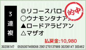 1着:◎リコースパロー(1人気) 2着:○ウナモンタナアルタ(2人気) 3着:△マザオ(4人気) 3連複:1-8-10:900円x12.2倍=10,980円 [hit_race:https://yoso.sp.netke...