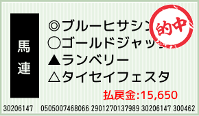 1着:◎ブルーヒサシン(1人気) 2着:○ゴールドジャッジ(2人気) 3着:▲ランベリー(3人気) 馬連:4-6:4,000円x2.5倍=10,000円 ワイド:4-6:3,000円x1.4倍=4,200円 3連単:6-...