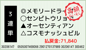 1着:◎メモリードライブ(4人気) 2着:○センビトウリョウ(1人気) 3着:▲オーセンティアン(2人気) 3連単:9-5-12:800円x89.8倍=71,840円 [hit_race:https://yoso.sp....