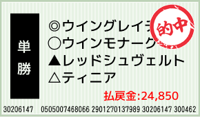 1着:◎ウイングレイテスト(7人気) 2着:☆カルロヴェローチェ(3人気) 3着: メイクアスナッチ(13人気) 単勝:8:1,000円x12.6倍=12,600円 複勝:8:1,000円x12.6倍=12,600円 [...