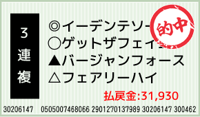 1着:◎イーデンテソーロ(1人気) 2着:△フェアリーハイ(4人気) 3着:☆スオードカット(6人気) 3連複:2-6-10:1,000円x17.5倍=17,500円 3連単:2-10-6:300円x48.1倍=14,4...