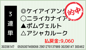 1着:○ダイアゴナルラン(2人気) 2着:△テルレーヌ(5人気) 3着:◎ピエールドラゴン(4人気) 複勝:5:5,000円x2.5倍=12,500円 [hit_race:https://yoso.sp.netkeiba...
