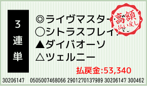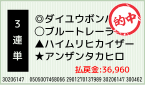 1着:○ブルートレーラー(2人気) 2着:▲ハイムリヒカイザー(3人気) 3着:◎ダイユウボンバー(1人気) 3連単:8-2-1:1200円x30.8倍=36,960円 [hit_race:https://yoso.sp...